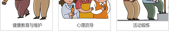 康復(fù)護(hù)理:保存老人的日常獨(dú)立生活能力,由專(zhuān)業(yè)康復(fù)師根據(jù)老人身體情況制定康復(fù)計(jì)劃,并在老人身體條件許可的情況下,針對(duì)疾病和損傷造成的功能障礙,采取各種康復(fù)護(hù)理措施,減少或預(yù)防后遺癥,極大限度地恢復(fù)其活動(dòng)能力,減輕老人的病痛,促進(jìn)健康。