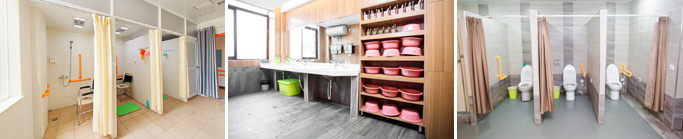 普親養(yǎng)老機(jī)構(gòu)的洗漱臺(tái)、衛(wèi)生間、洗浴室均實(shí)行干濕分離,主要目的是提高安全性,確保老人不會(huì)因水花四濺的地板積水而滑倒。干濕分開(kāi),就可保持沐浴之外的場(chǎng)地干燥衛(wèi)生,且方便護(hù)理人員協(xié)助老人如廁。