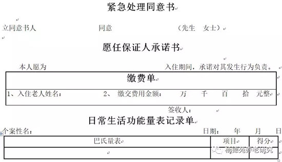 (3)向機構(gòu)提出必要書面及處理申請:機構(gòu)的社工主要掌握多專業(yè)分工,前期主要工作是確保老人的保證書填寫、合約書提出,委托書及入退機構(gòu)申請書等文書的手續(xù)齊全。