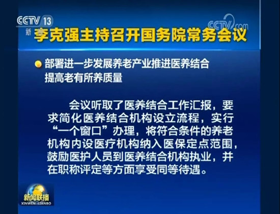 會議聽取了醫(yī)養(yǎng)結合工作匯報,要求強化支持政策落實,促進現(xiàn)有醫(yī)療衛(wèi)生和養(yǎng)老機構合作,發(fā)揮互補優(yōu)勢。簡化醫(yī)養(yǎng)結合機構設立流程,實行“一個窗口”辦理。將符合條件的養(yǎng)老機構內(nèi)設醫(yī)療機構納入醫(yī)保定點范圍。促進農(nóng)村和社區(qū)醫(yī)養(yǎng)結合,建立村醫(yī)參與健康養(yǎng)老服務的激勵機制。鼓勵醫(yī)護人員到醫(yī)養(yǎng)結合機構執(zhí)業(yè),并在職稱評定等方面享受同等待遇。