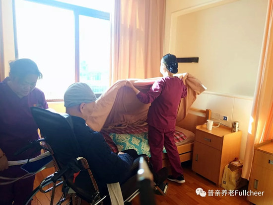 ▲于彩云和同事給剛起床的老人穿衣,整理床鋪,每項(xiàng)工作都有標(biāo)準(zhǔn)化的服務(wù)流程。