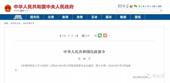 此標(biāo)志著民政部自2013年7月1日起執(zhí)行的《養(yǎng)老機(jī)構(gòu)設(shè)立許可辦法》(2013民政48號(hào)令)將正式成為歷史,老友邦認(rèn)為這是深化養(yǎng)老“放管服”的一項(xiàng)重要事件。