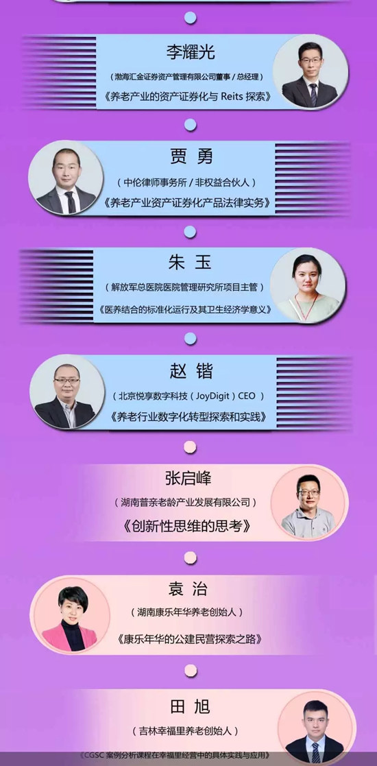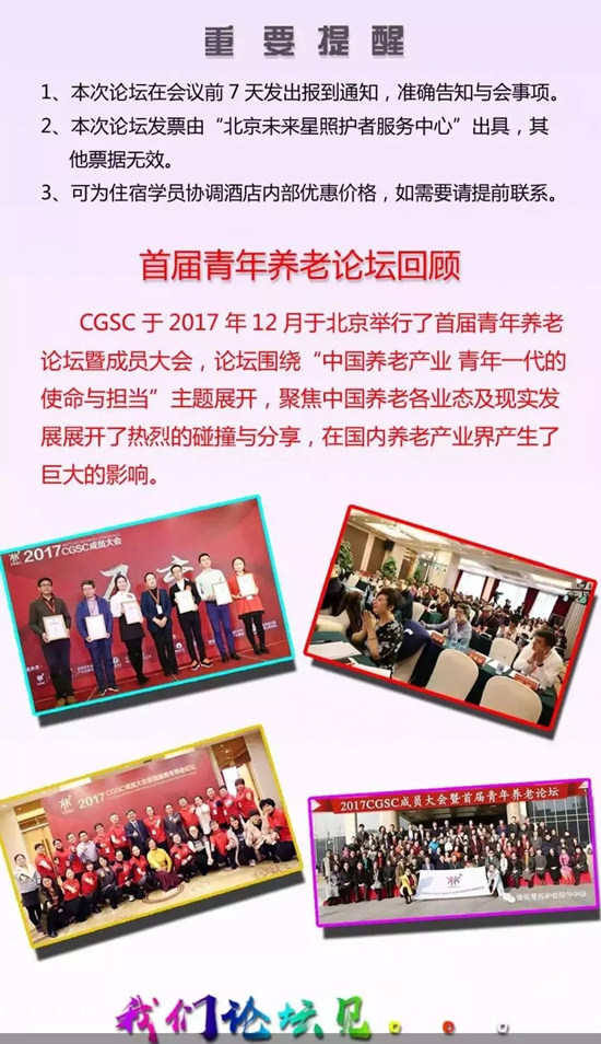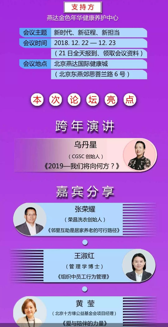 告別2018,迎接2019。由CGSC主辦的《第二屆青年養(yǎng)老論壇》將於2018年12月22-23在北京舉行。每年圣誕節(jié)前的那個(gè)周末,來一次回顧與反思,聚智聚力聚心,跨界跨域跨行,為邁進(jìn)下一個(gè)新起點(diǎn)洗腦充電。年輕一代,是中國明天的希望,更是中國養(yǎng)老產(chǎn)業(yè)明天的希望。CGSC,給他們家的溫暖,發(fā)聲的平臺(tái),前行的動(dòng)力,明天的思考。青苗千人計(jì)劃,臺(tái)灣公益游學(xué),月度專業(yè)分享,眾人陪你讀書…以70后為主的專委會(huì)團(tuán)隊(duì),以互聯(lián)互通互助為核心理念的平臺(tái)搭建,CGSC,一個(gè)養(yǎng)老行業(yè)的公益組織,終將會(huì)成為一面引領(lǐng)中國養(yǎng)老產(chǎn)業(yè)年輕一代的偉大旗幟。中國養(yǎng)老,靠什么走出低谷,走向明天?不是靠政府,不是靠政策,靠的是三大力量: 資本的力量,專業(yè)的力量,公益的力量?抠Y本為引擎拉動(dòng)產(chǎn)業(yè),靠專業(yè)為依托提升品質(zhì),靠公益為藍(lán)海推波助瀾。2018,在資本上我們付出了怎樣的代價(jià)?在專業(yè)上我們有了哪些提升,還存在哪些缺陷?在公益上我們忽略了哪片藍(lán)海?在跨界上,在創(chuàng)新上,在新型組織構(gòu)建上,在商業(yè)模式上,還有哪些機(jī)會(huì)與挑戰(zhàn)?兩天,來自不同領(lǐng)域的24位演講嘉賓,老中青三代,將傾情分享他們的經(jīng)驗(yàn)與心歷路程。最后收尾,仍是我的跨年演講《2019,我們將向何處?》。沒有名角,沒有高大上。一顆平常心,一群有志者。一樣的論壇,期待不一樣的收獲…北京,1222,我們不見不散!