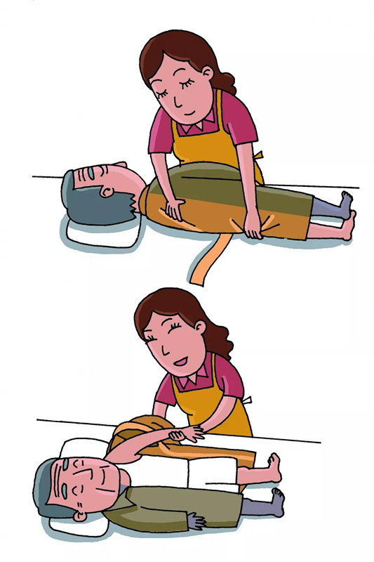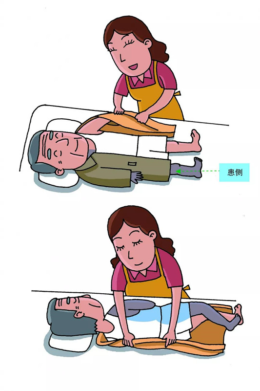 2)協(xié)助老人患側(cè)臥位,將已經(jīng)脫下的衣服部分塞進(jìn)老人身下,再放平身體;