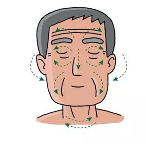 3)浸泡毛巾,擰干,用方毛巾包裹在手上,按序擦洗長者面部:眼睛→額部→鼻翼→面部→頜部→耳→頸部。