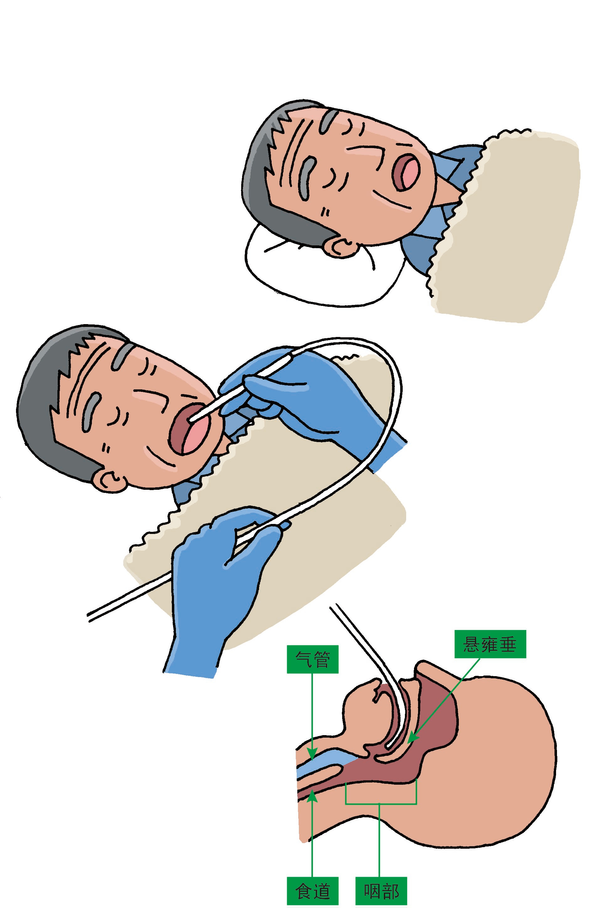 1、雖然要注意不要讓導管碰到舌根和粘膜,但也不要用手指按著導管二十順其自然地插入口腔中。