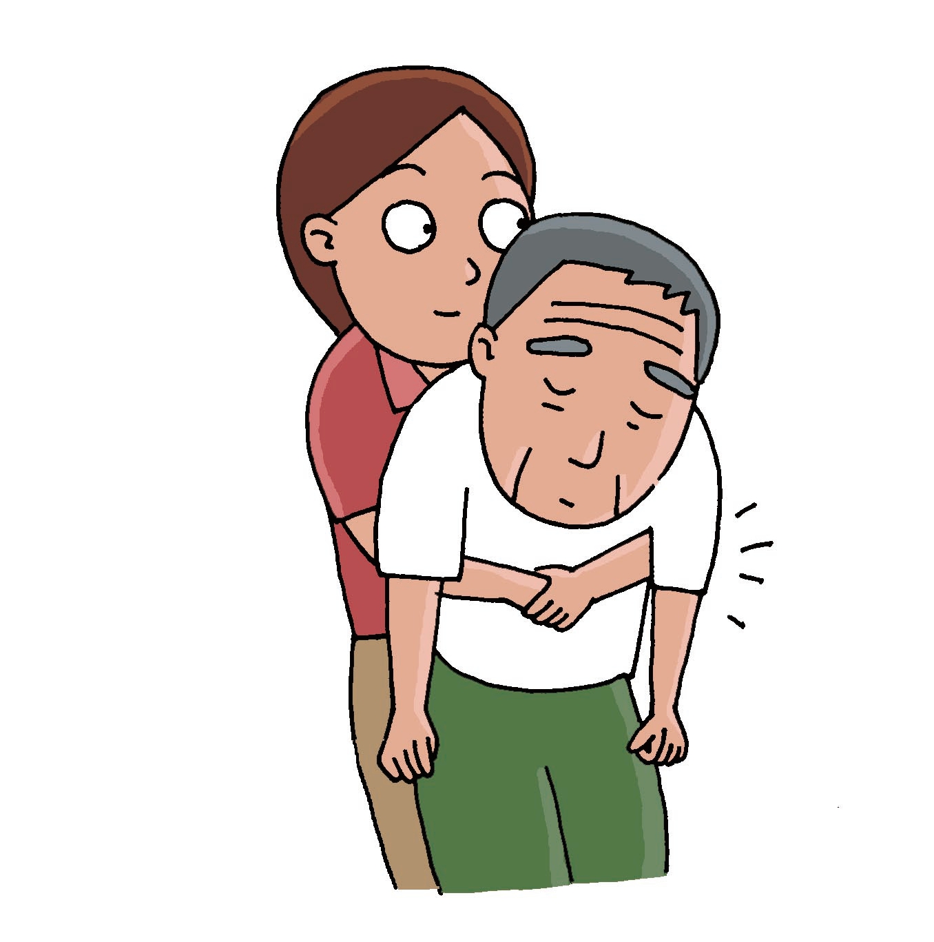 、谧尰颊呱眢w向前彎下,用手掌根在肩胛骨之間猛擊幾次。