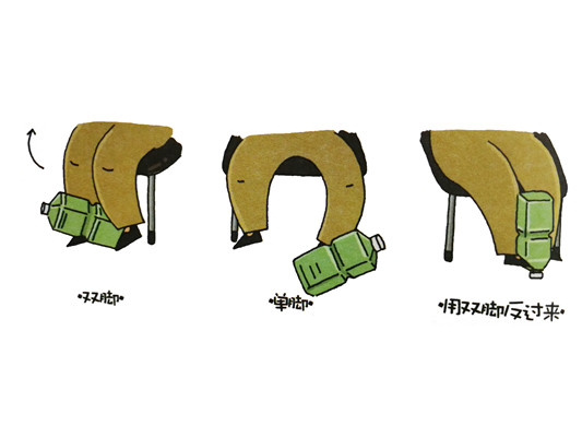 ②一只手拿塑料瓶,穿過肩膀處,遞換給另外一只手。