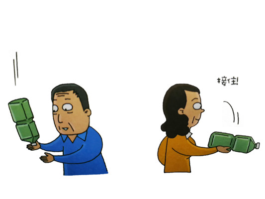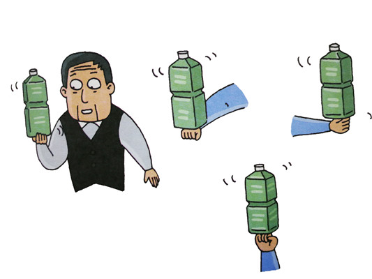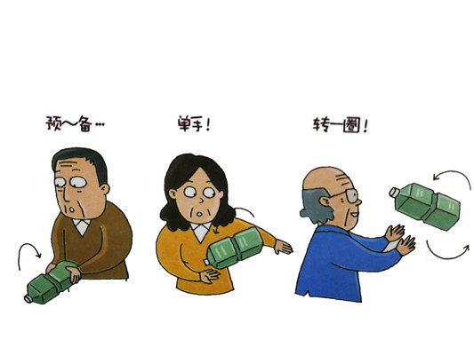 不是往上拋而已,為了使之翻轉(zhuǎn),試試運(yùn)用手腕來拋塑料瓶。