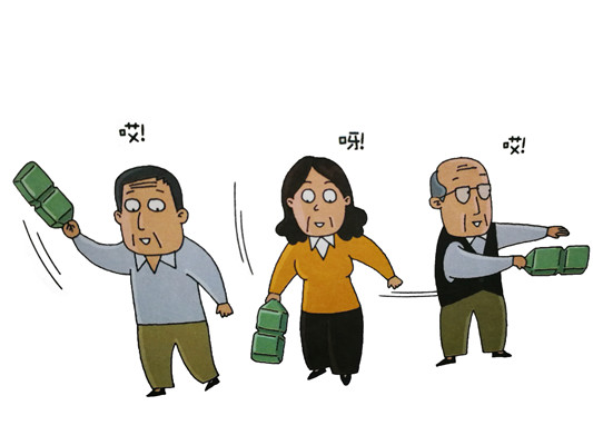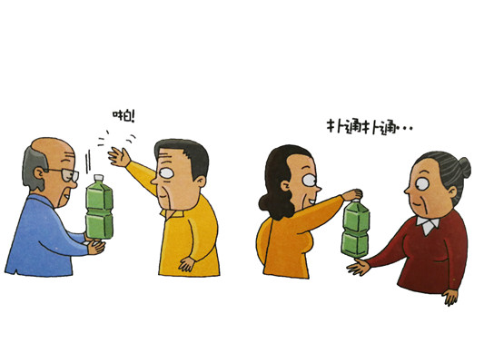 、劬拖袷终仆聜(cè)劈一樣,將塑料瓶往下?lián)]舞。