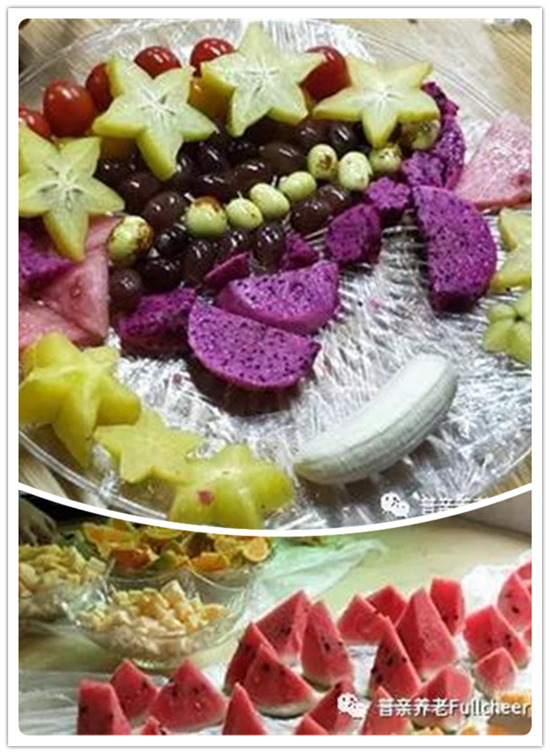 光喝茶還不夠,再來一份水果拼盤。大家刀工如何,看成果就知道了,不少拼盤還是我們的爺爺奶奶們親自動手做的呢。