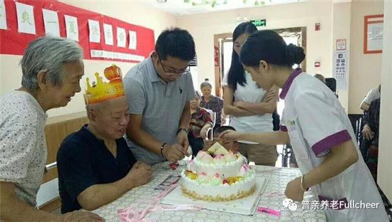 ▲每個月普親養(yǎng)老都會為入住的老人們舉辦生日會,準備大蛋糕。祝爺爺生日快樂!