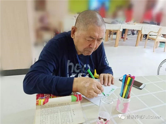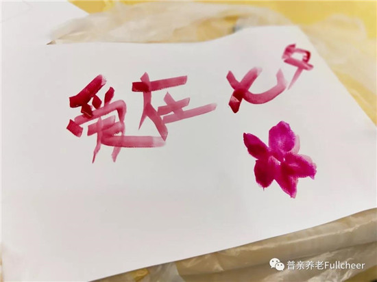 ▲?谑衅沼H第二老年養(yǎng)護(hù)院的爺爺在經(jīng)過慎重思考畫的結(jié)構(gòu)、布局、用色之后寫了四個(gè)大字,也是很棒了。