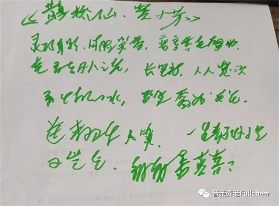 小芳就是我們機(jī)構(gòu)的社工符嶸芳,高校社會(huì)工作專業(yè)碩士,專業(yè)知識(shí)扎實(shí),在普親養(yǎng)老也積累了不少的工作經(jīng)驗(yàn)。符嶸芳每天都會(huì)帶領(lǐng)老人參加院內(nèi)活動(dòng),快樂垂釣、趣味保齡球……工作認(rèn)真,總是笑盈盈的,社工的種種努力都讓孫爺爺看在眼里。在七夕活動(dòng)的自由表達(dá)環(huán)節(jié),孫爺爺有感而發(fā),主動(dòng)提筆寫下這首詞。