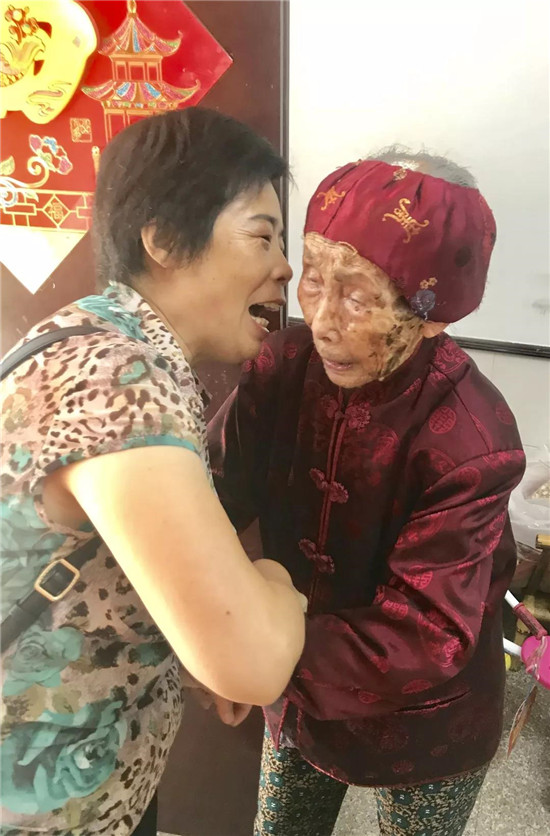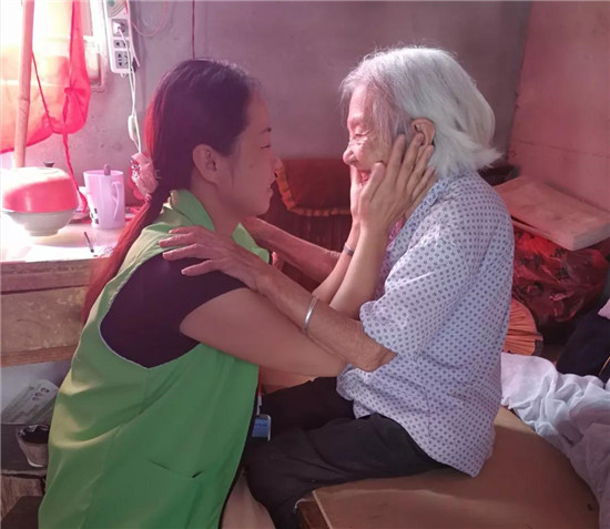 103歲的陳奶奶看見幫扶小組來了還特意換上了新衣服,開心的和幫扶小組的成員聊天。