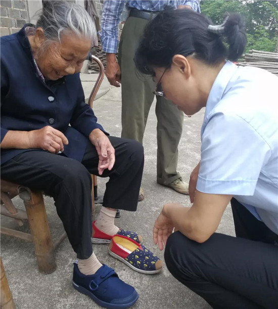 李爺爺已經(jīng)100歲了,依然精神矍鑠,穿上幫扶小組贈(zèng)送的新鞋非常高興。