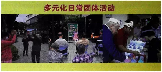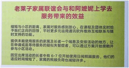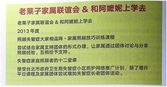 從2013年開始,養(yǎng)護(hù)中心進(jìn)行了一個(gè)新的嘗試,辦理老萊子家屬聯(lián)誼會(huì),名字來源于中國24孝老萊子的故事,就是讓在家里照顧失智長輩的家庭能夠使用日間照護(hù)中心的空間,老人的活動(dòng)由日間照護(hù)人員提供課程,也對(duì)老人的家屬提供支持性的課程。這個(gè)老萊子家屬聯(lián)誼會(huì)在臺(tái)北地區(qū)利用衛(wèi)生局的空間做推廣。另外從2015年開始,配合政府開展小規(guī)模多機(jī)能的服務(wù)。