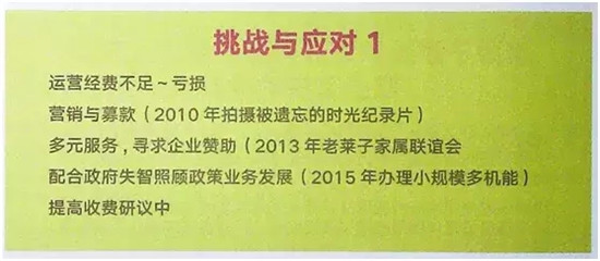 目前對(duì)整個(gè)機(jī)構(gòu)大的挑戰(zhàn)就是運(yùn)營經(jīng)費(fèi)。為了解決經(jīng)費(fèi)問題,中心一方面通過媒體及網(wǎng)絡(luò)宣傳自己,另外也通過各種辦法籌集資金。2010年拍攝了以關(guān)懷失智老人為主題的紀(jì)錄片《被遺忘的時(shí)光》,并通過部片子獲得了一部分政府補(bǔ)助款,影片上映的時(shí)候還有票房收入,通過影片的宣傳,還為基因會(huì)募集三千多萬新臺(tái)幣的善款,這部分資金可以支持心養(yǎng)護(hù)中心未來20年的運(yùn)營。