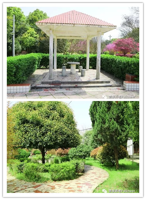 ⬆養(yǎng)護(hù)中心外的綠色休閑花園,樹木蔥蔥郁郁,曲徑通涼亭,特別適合老人們飯后茶余閑暇散心。