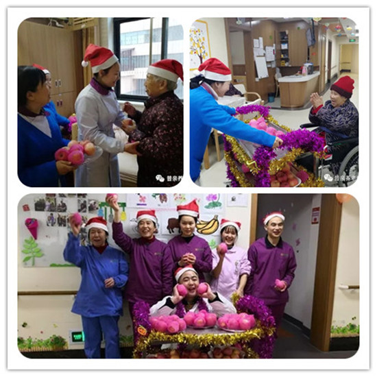 每年圣誕節(jié),工作人員都會提前裝扮好機構(gòu),營造節(jié)日的歡樂氛圍。等到了節(jié)日當天,工作人員們就會推著咱們的平安果子推車一層樓一層樓地轉(zhuǎn)悠,將每個飽含心意的蘋果送到我們的老人手中。