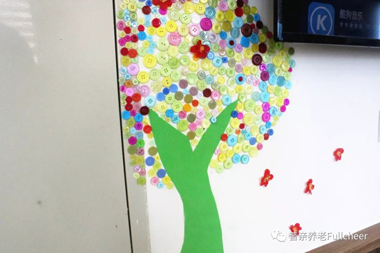 護(hù)理員網(wǎng)購來五顏六色的可愛扣子,帶著老人利用工作之外的閑暇時間,打造出了一棵五彩繽紛的常青樹。