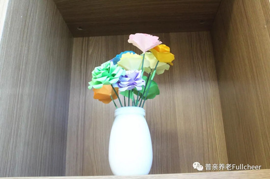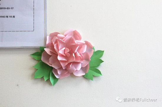 收獲了眾多好評的藍(lán)色系折紙花,讓單調(diào)的墻面多了浪漫點(diǎn)綴,裝扮了老人們的生活環(huán)境,還被院長選為了“最受喜愛的環(huán)創(chuàng)作品”。