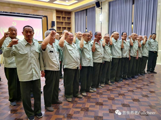同樣的活動(dòng)也在濟(jì)寧市普親老年養(yǎng)護(hù)院內(nèi)莊嚴(yán)舉行。7月1日,25位平均年齡70歲的老黨員高舉右手,莊嚴(yán)宣誓,重溫入黨誓詞,深切感受黨員的責(zé)任、使命和榮耀。