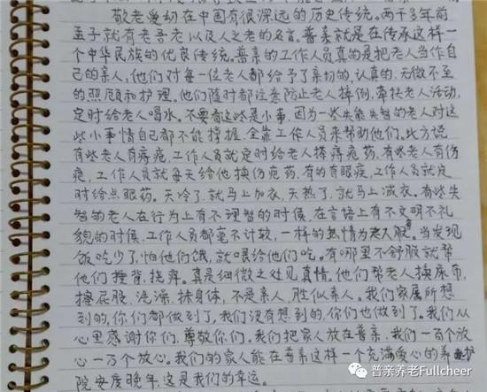 我們家屬能想到的,普親人做到了,我們沒(méi)想到的,你們幫我們考慮到了,作為家屬,我萬(wàn)分尊敬你們,感謝你們。把最親的人放在普親,我們一百個(gè)放心,一萬(wàn)個(gè)放心。我們的家人能在普親這樣一個(gè)充滿愛(ài)心的大家庭安度晚年,這是我們的幸運(yùn)。