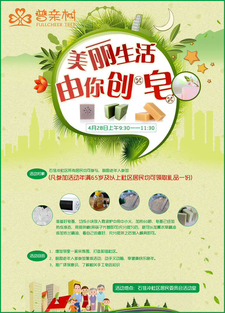 1、凡參加當(dāng)日活動的居民需提前到社區(qū)進行登記,以便工作人員提前準備當(dāng)日做手工皂的材料。