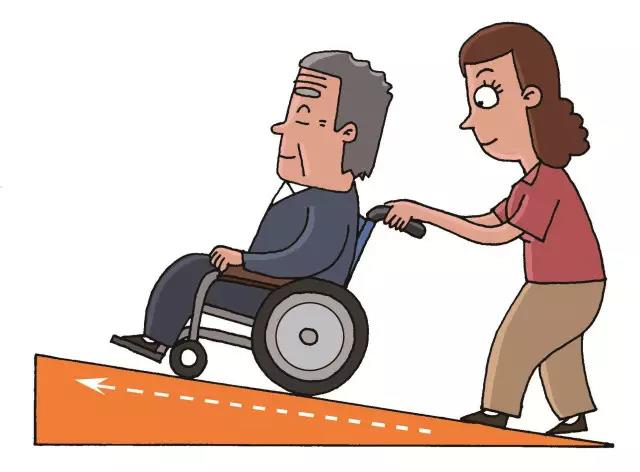 上坡:讓患者上半身前傾,用全身力氣將輪椅向上推著前進(jìn)。