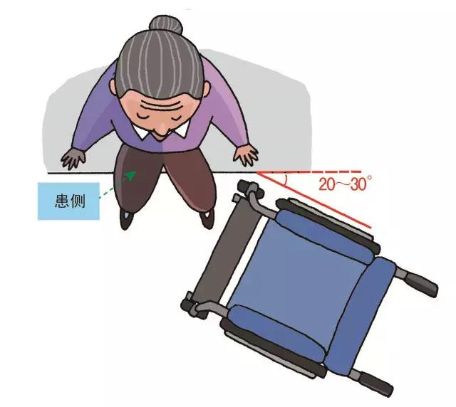 1、將輪椅面向床擺放,傾斜角度大約在20°—30°。