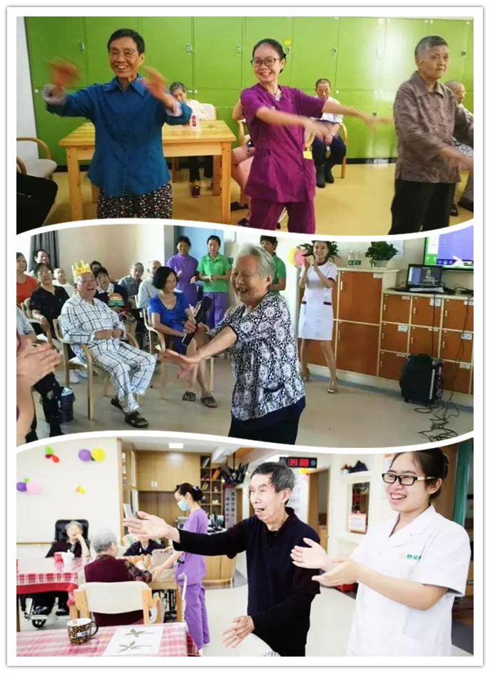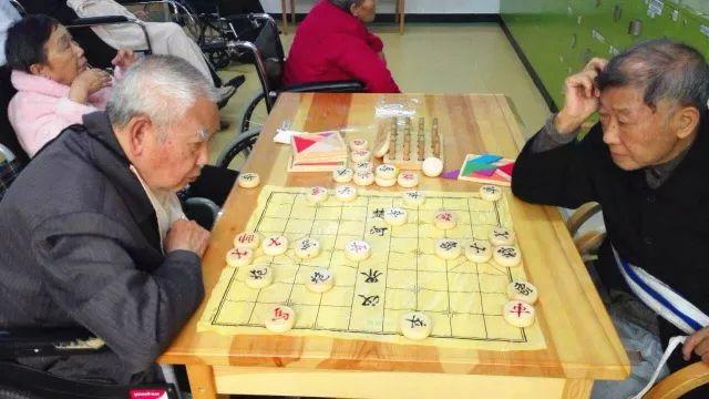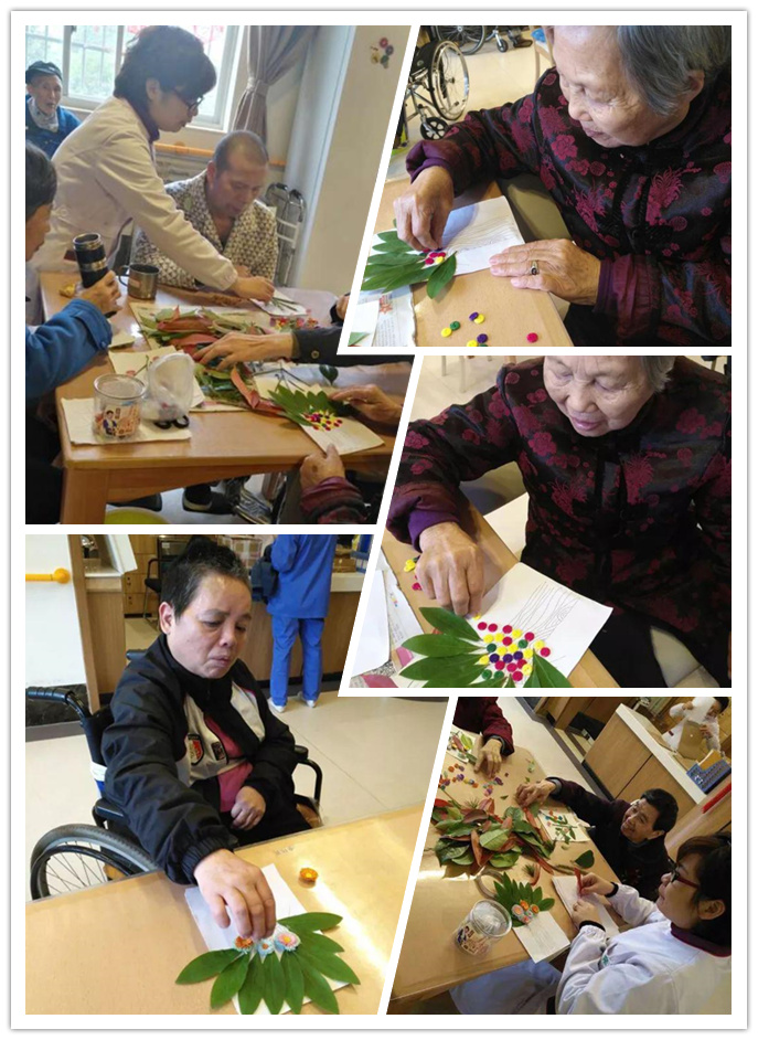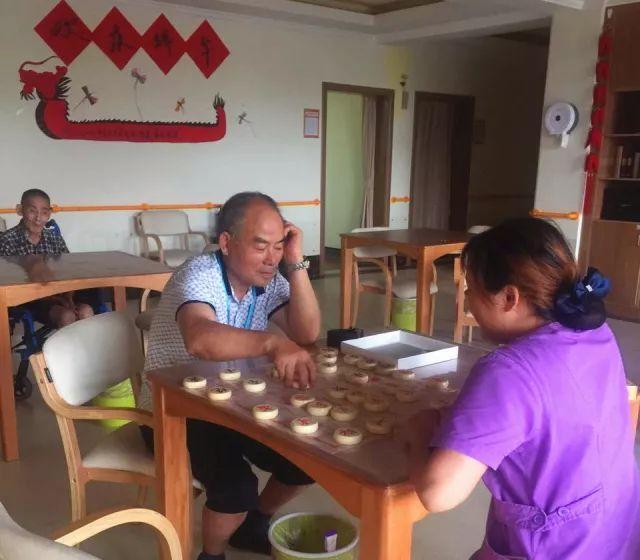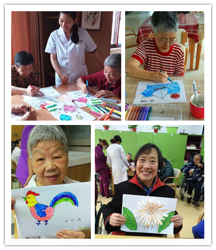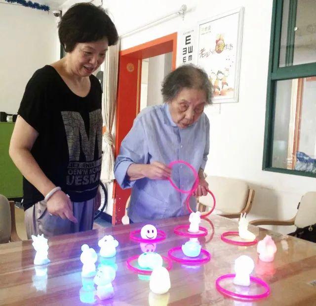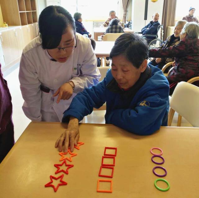 而機(jī)構(gòu)的護(hù)理人員與康復(fù)師也會陪在老人身邊,帶著老人們做早操、拼紙板、套圈、下棋、做手工…