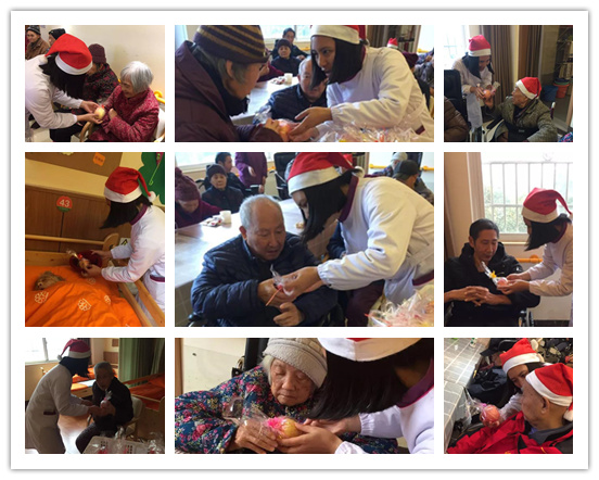 得益于年輕志愿者們的積極參與,普親先鋒機(jī)構(gòu)的老人們過了一個(gè)朝氣蓬勃的圣誕節(jié)。一大早,志愿者們就來到機(jī)構(gòu)打掃衛(wèi)生、布置裝飾,讓機(jī)構(gòu)一下便有了節(jié)日的氛圍;護(hù)理員為爺爺奶奶們戴上了小紅帽,送上了象征著平安的果子,帶著長輩們一起玩圣誕涂鴉,不亦樂乎。