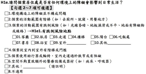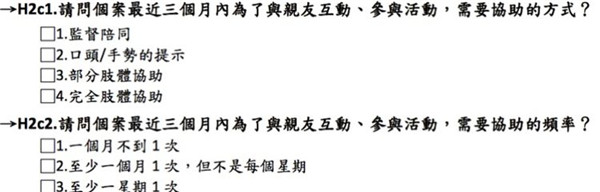 H2的部分是社會(huì)參與,從以前的一題變成三題了,后續(xù)還有提供服務(wù)來(lái)滿(mǎn)足個(gè)案的社會(huì)參與需求。