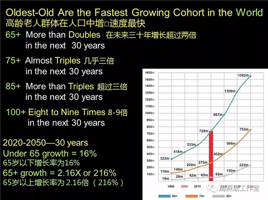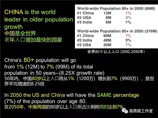 中國80歲以上的老人會(huì)從目前的1200萬增加到9900萬,到2050,中國老年人口占全國人口的比例跟美國是一樣的。但是中國的絕對(duì)人口數(shù)量是要比美國多幾倍的,美國人認(rèn)為這是非常大的問題,對(duì)中國來說,這個(gè)挑戰(zhàn)尤為巨大。