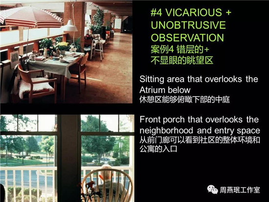 像這樣一種既能夠?yàn)橛^察者提供一些視覺上的保護(hù),又能夠鼓勵(lì)他們?nèi)ミh(yuǎn)眺景色而又不顯眼的眺望區(qū),對(duì)老人來說非常重要。這個(gè)是我覺得能夠提升社會(huì)交往興趣和相互遠(yuǎn)觀關(guān)注度的做法。