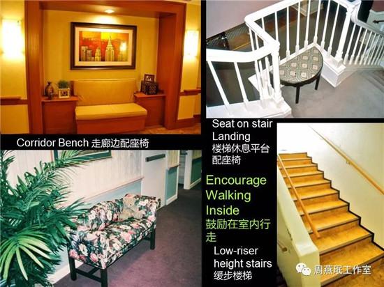 鍛煉不光在室外,在室內(nèi)一定要繼續(xù),走廊、樓梯都存在老人鍛煉的機(jī)會(huì)。除了座椅是必須設(shè)置的,臺(tái)階的高度也一定要控制好,另外踏步之間布置休息平臺(tái)也十分必要?傊鍛煉的理念要從室內(nèi)到室外,貫始至終。