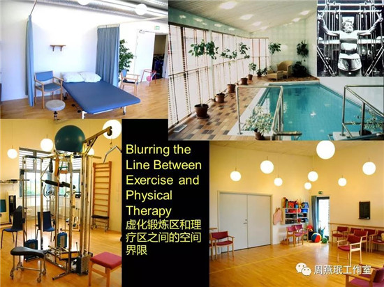 鍛煉對(duì)于每個(gè)人來說都得做,護(hù)理、理療或者是康復(fù)訓(xùn)練是一部分老人需要做。與其將他們分開,不如讓他們結(jié)合到一起。圖中是歐洲一個(gè)建筑中所有有關(guān)理療和鍛煉的空間,可以看出,通過合理的手段將這兩者有機(jī)的結(jié)合在一起相當(dāng)重要。