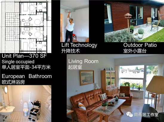 這個(gè)項(xiàng)目就是引出我今天要講的一個(gè)重要方面——生活模式,荷蘭公寓樓的生活模式。這個(gè)模式強(qiáng)調(diào)的就是,其實(shí)很多老人不需要入住護(hù)理院的,絕大多數(shù)通過這樣的專門設(shè)施,實(shí)現(xiàn)就地養(yǎng)老是最理想的。這個(gè)項(xiàng)目時(shí)間很久了,是90年代在荷蘭鹿特丹的項(xiàng)目,項(xiàng)目本身就是采用這樣一個(gè)概念,老人可以就地老化,不要再搬出去了。這個(gè)項(xiàng)目居室情況是很有特點(diǎn)的,首先是為終身生活而設(shè)計(jì),面積非常大,可以個(gè)性化的進(jìn)行裝飾,很多老人在里面裝了非常多的書、收藏品等等。另外還有小的房間是給訪客居住使用的。