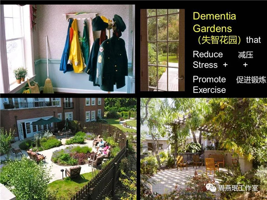 對(duì)于失智老人,有這樣一種失智花園非常重要,研究表明,這對(duì)于降低老人的醫(yī)療消費(fèi)十分有效。所以在失智設(shè)施中必須要有安全的失智花園。