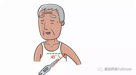 3、將體溫計(jì)傾斜45°角插入腋下,插入位置為腋窩最深處,上臂夾緊