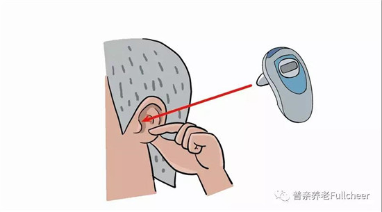 2、將耳垂輕輕向后上方拉起,讓外耳道呈現(xiàn)筆直狀態(tài),然后插入體溫計(jì)