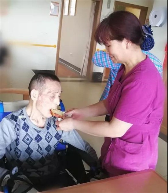 剛開(kāi)始老人也非常不配合護(hù)理,吃流食稍不注意就會(huì)到處亂噴,好幾次都將口中的食物噴到盧冬梅的臉上。他的母親看到了覺(jué)得不好意思,想自己來(lái)喂,但盧冬梅一臉微笑地說(shuō):“沒(méi)事的,放心爺爺只是剛來(lái)不習(xí)慣過(guò)幾天就會(huì)好的”。通過(guò)盧阿姨的耐心護(hù)理,爺爺適應(yīng)了養(yǎng)老院的生活,也和盧阿姨相處融洽。