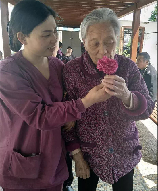 在熊阿姨和機(jī)構(gòu)的其他護(hù)理員的照顧下,張奶奶可以借助助行器行走,可以唱歌、自己吃飯、自訴大小便了。熊阿姨的照顧也讓張奶奶的9位子女看在眼里,他們送來(lái)錦旗表示感謝。熊阿姨看到自己的努力得到了肯定,偷偷地抹淚了。