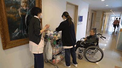 路過休息區(qū),遇到了兩位高齡老人——山中太太和Taki太太,她們是同學,一起陪伴入住養(yǎng)老院,已經(jīng)95歲了。