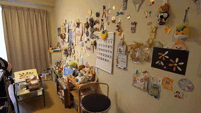 我們也可以順便看到奶奶房間里個性化的布置,墻上貼滿了各種圖案、玩偶。桌椅上也擺著很多小玩具。這些小玩意兒讓整個房間的感覺變得充滿了生活氣息,更像家。
