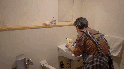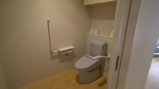 一進門,就是簡潔的衛(wèi)生間,出入空間的設計足夠讓坐輪椅的老人也能順利如廁;除此之外,馬桶邊的墻上都安裝了扶手,門用的是推拉門,同樣是為了方便輪椅老人使用。