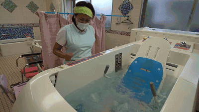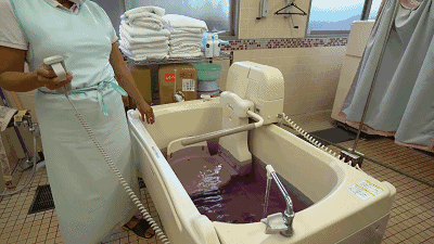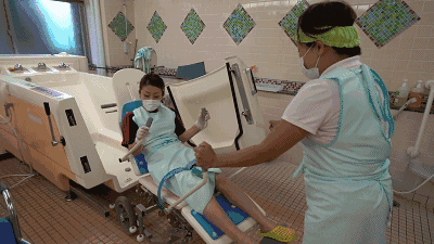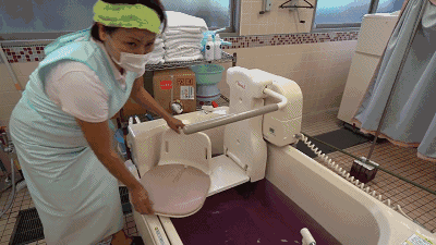 如果是行動更加不便的老人,就需要這款配合輪椅使用的浴缸。護理員先將老人在配套的輪椅上固定好,再推進浴缸,然后開始全自動注水、按摩。