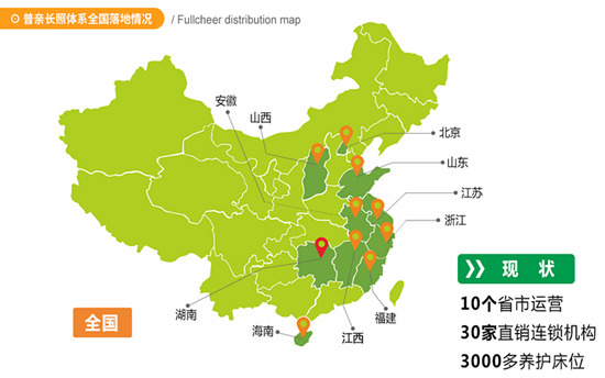 十年里,普親養(yǎng)老從海南開始,一路向北,在湖南扎根,又陸續(xù)向江西、福建、浙江、安徽、江蘇、山東、北京等省市挺進,到目前已實現(xiàn)了10個省市運營,30家直營連鎖機構,3000多養(yǎng)護床位的連鎖版圖目標。