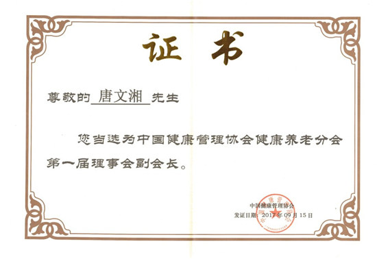 湖南普親老齡產(chǎn)業(yè)發(fā)展有限公司董事長(zhǎng)唐文湘先生,當(dāng)選為中國(guó)健康管理協(xié)會(huì)第一屆理事會(huì)副會(huì)長(zhǎng)。